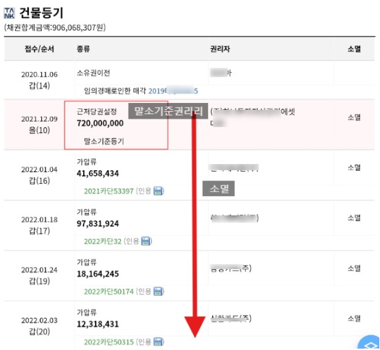 건물등기는 위와같이 최우선 등기가 권리상 말소기준 권리인 "2021.12.09 근저당권설정"에 해당됨으로