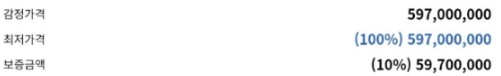 아파트 물건으로 최저 입찰가는 597,000,000원 이다.